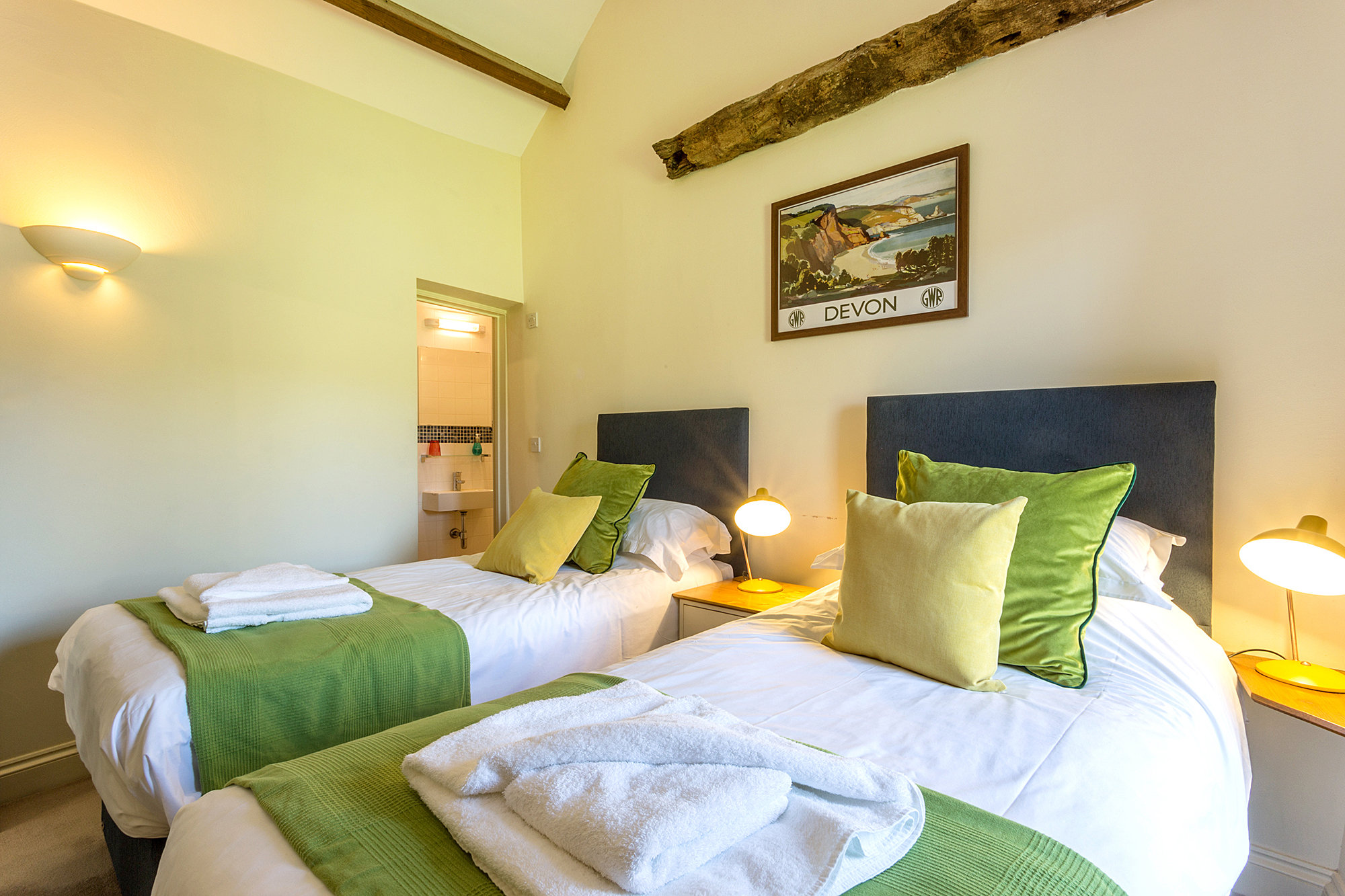 This is a ground floor room with zip and link beds (super king or twin) and doors to the garden. It has an ensuite shower room.