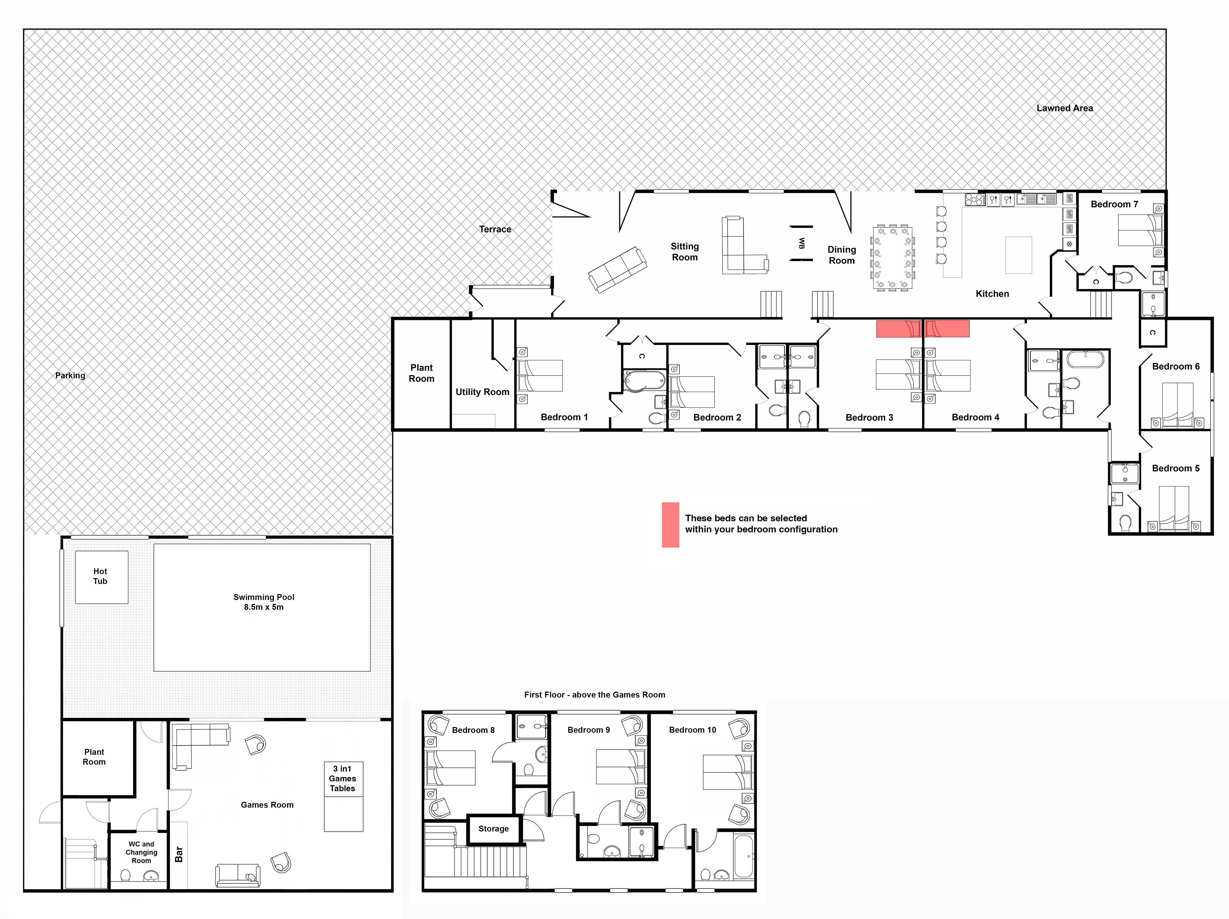 This room is on the first floor above the games room and has zip and link beds (super king or twin), and an ensuite shower room.
