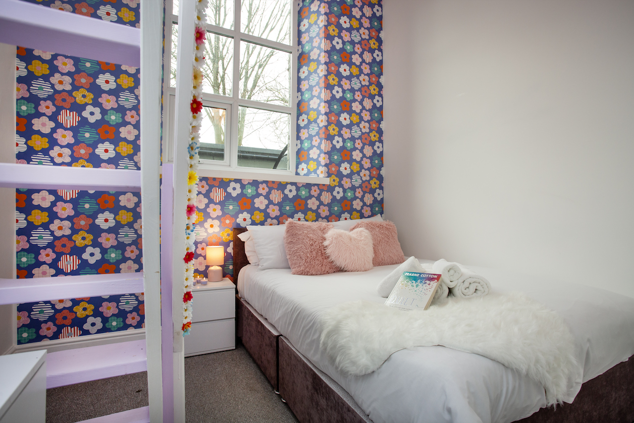 Heavenly Palooza: Flower Bedroom has a king size bed on the ground floor and 2 singles at loft level -