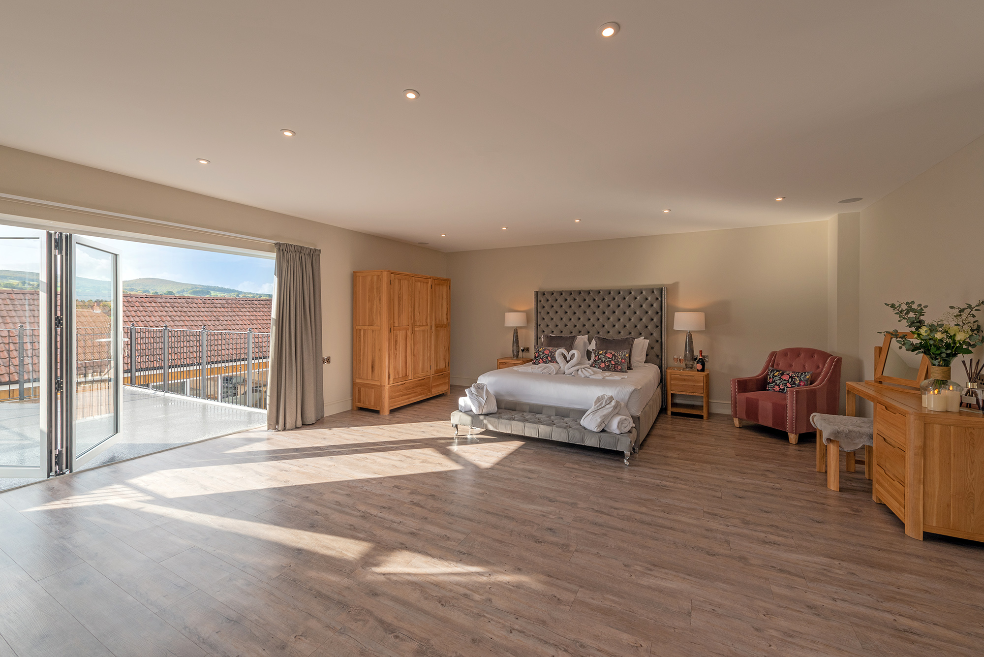 Inwood Farmhouse - Bedroom 5 (Sky Lane): A superking bed, a free standing bath, en suite shower room and veranda Bedroom 5 - Sky Lane