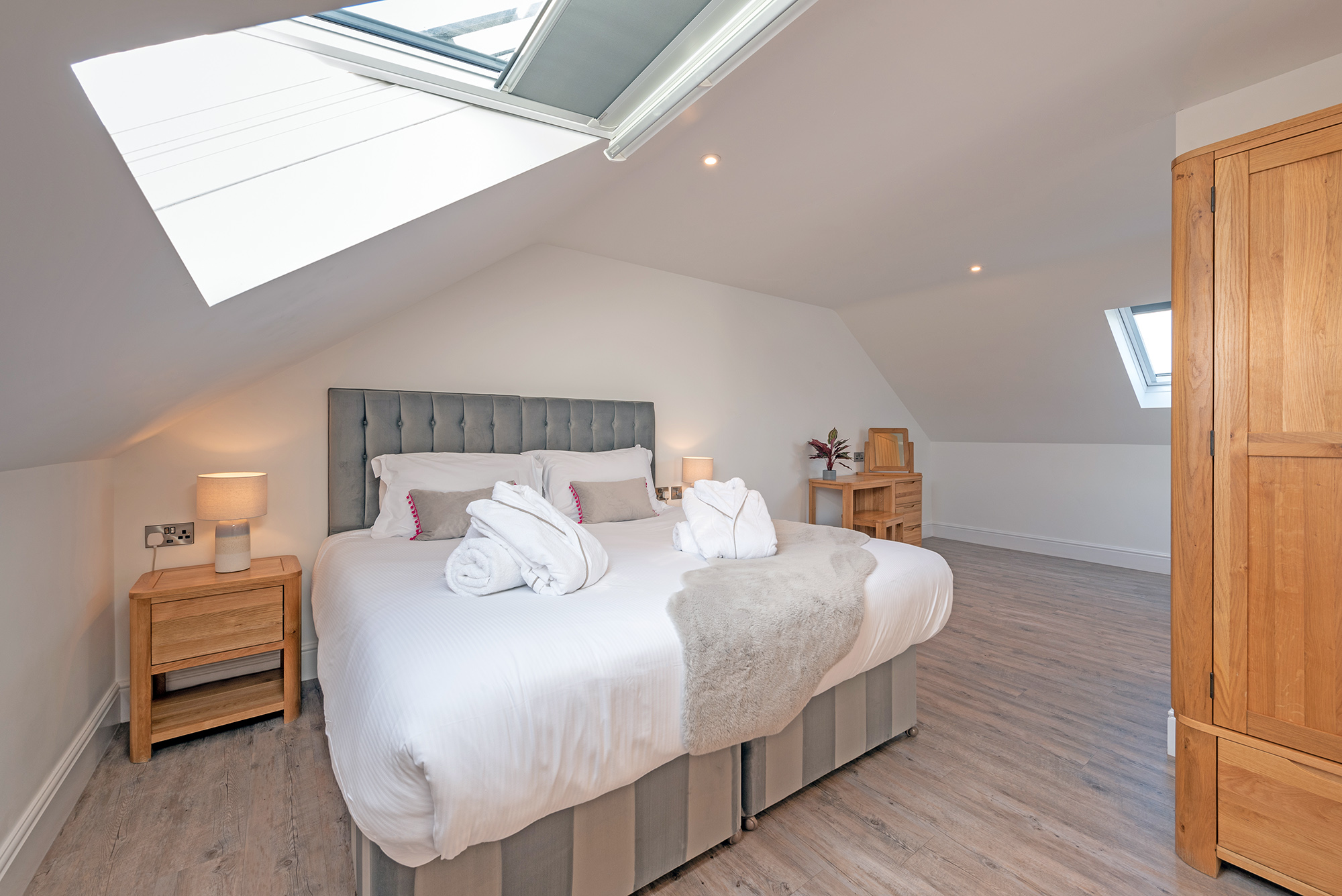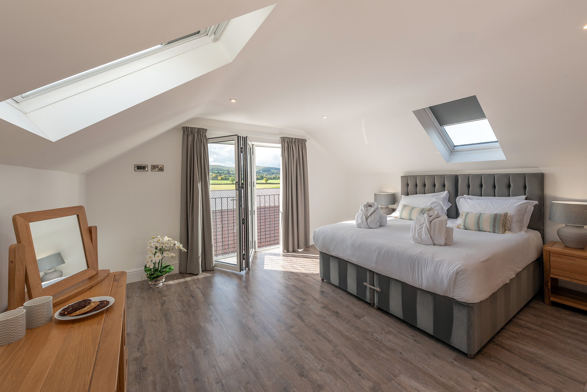 This is on the first floor and has zip and link beds (super king or twin) and an ensuite bathroom with a spa bath and separate shower.