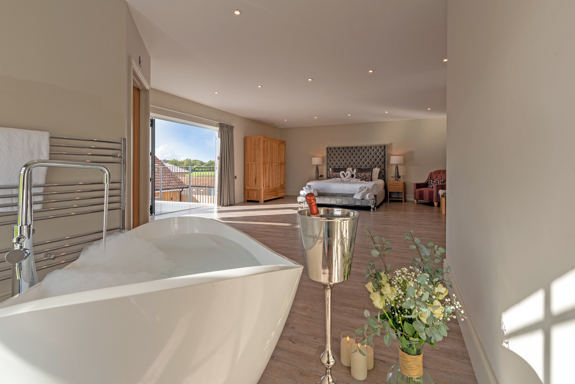 Inwood Farmhouse - Bedroom 5 (Sky Lane): A superking bed, a free standing bath, en suite shower room and veranda -