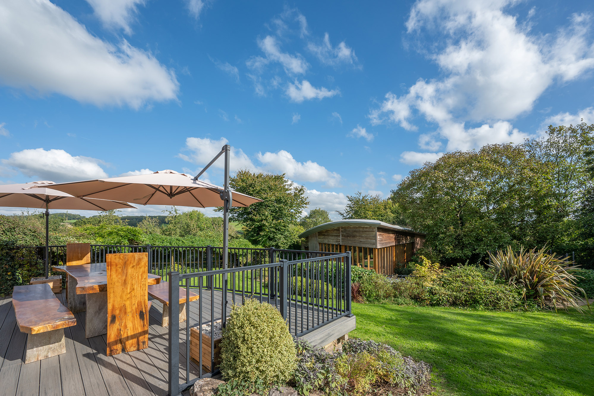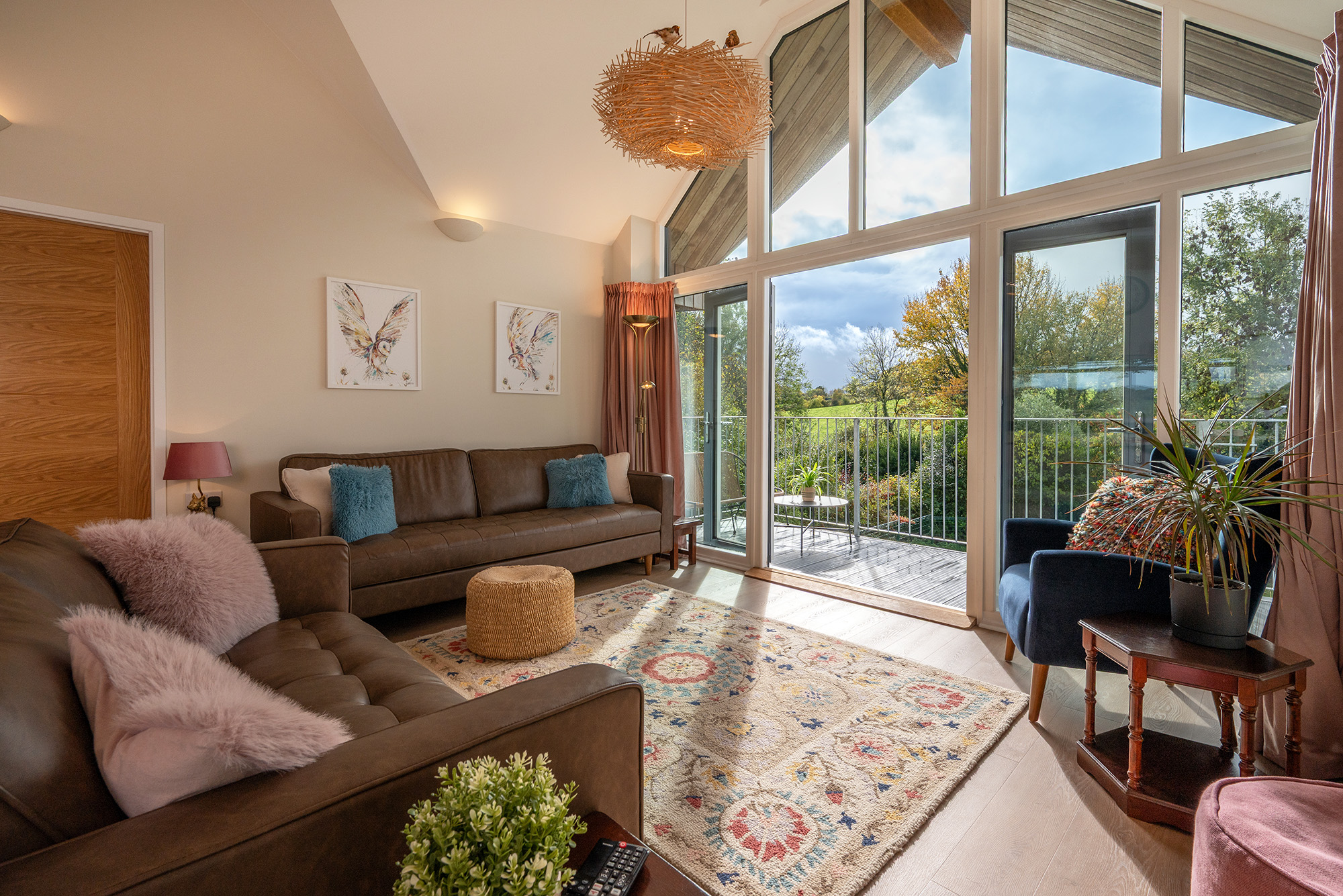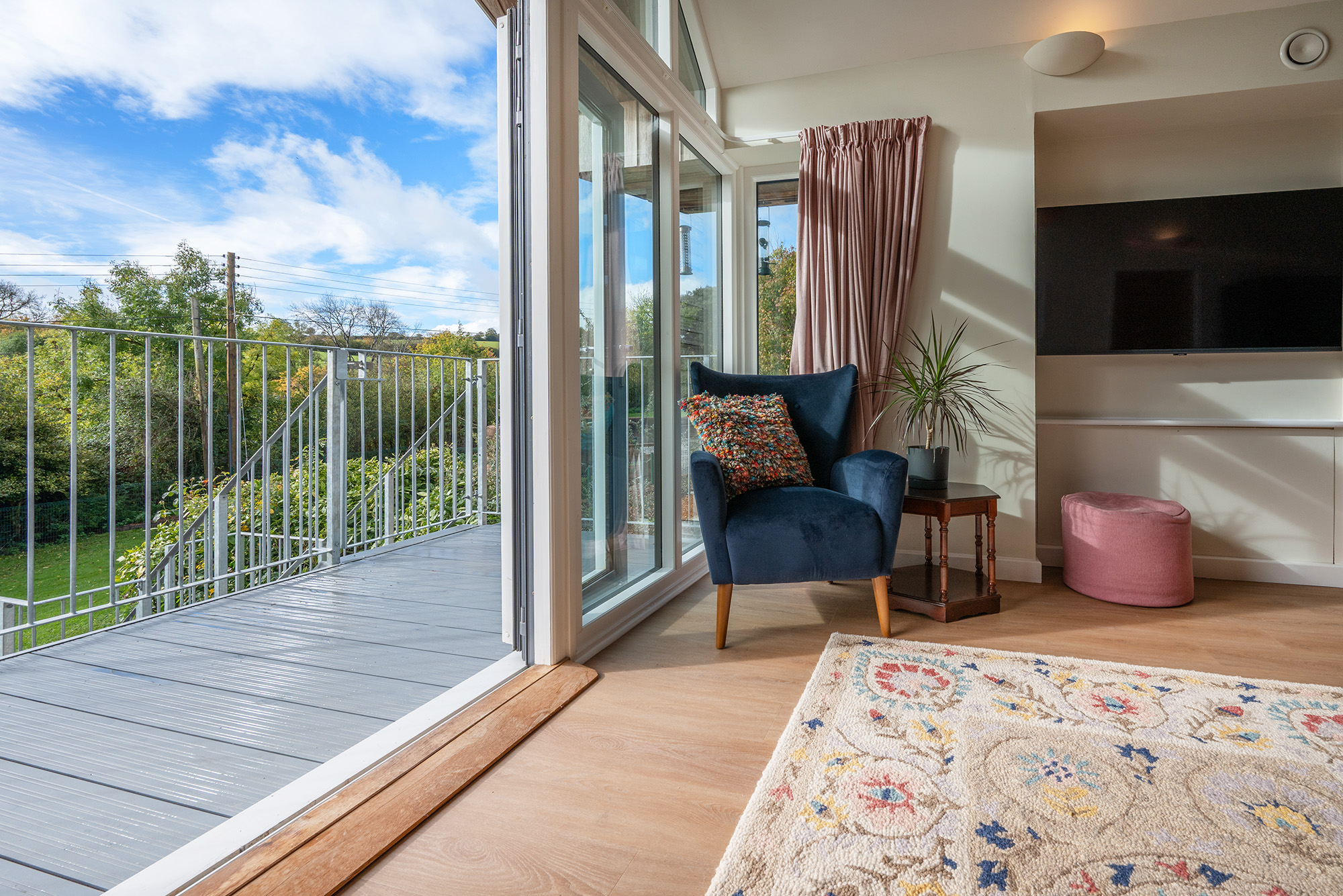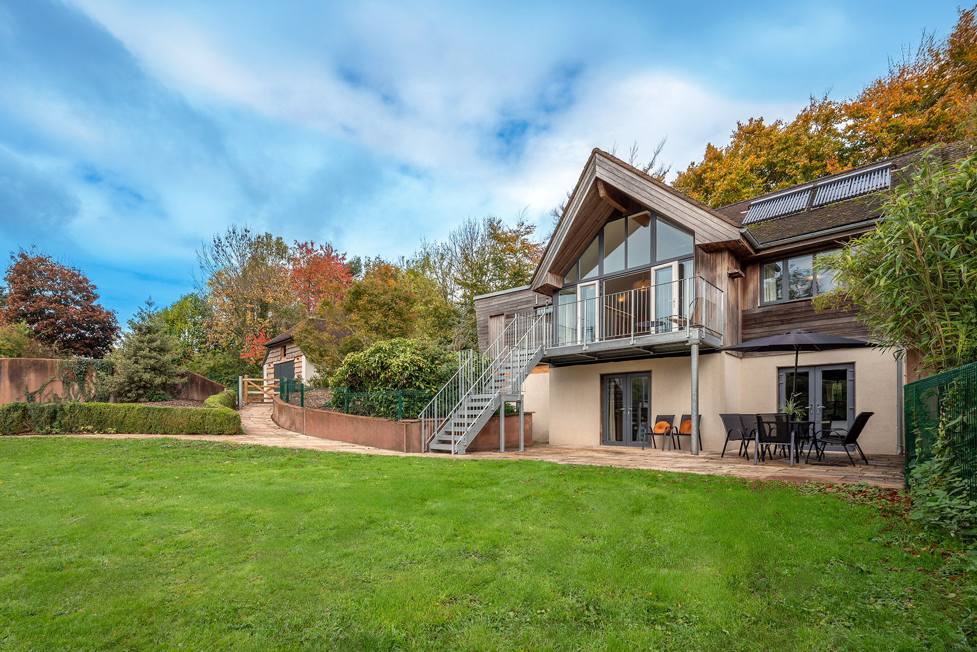 Jays Roost - House 2: The living area opens onto a balcony with steps down to the garden -