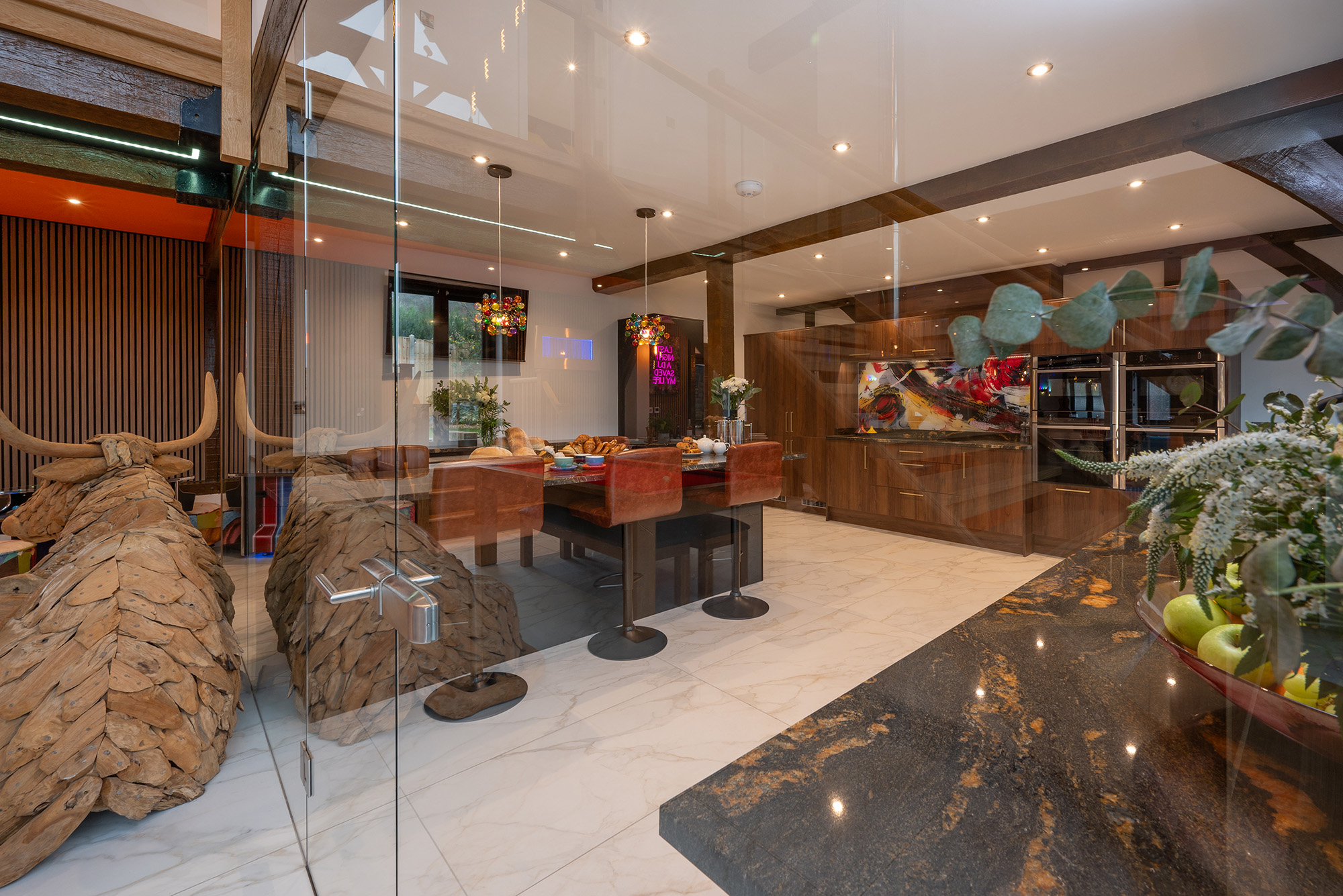 Jollyoaks - The kitchen is separated from the living space by a full height glass wall -