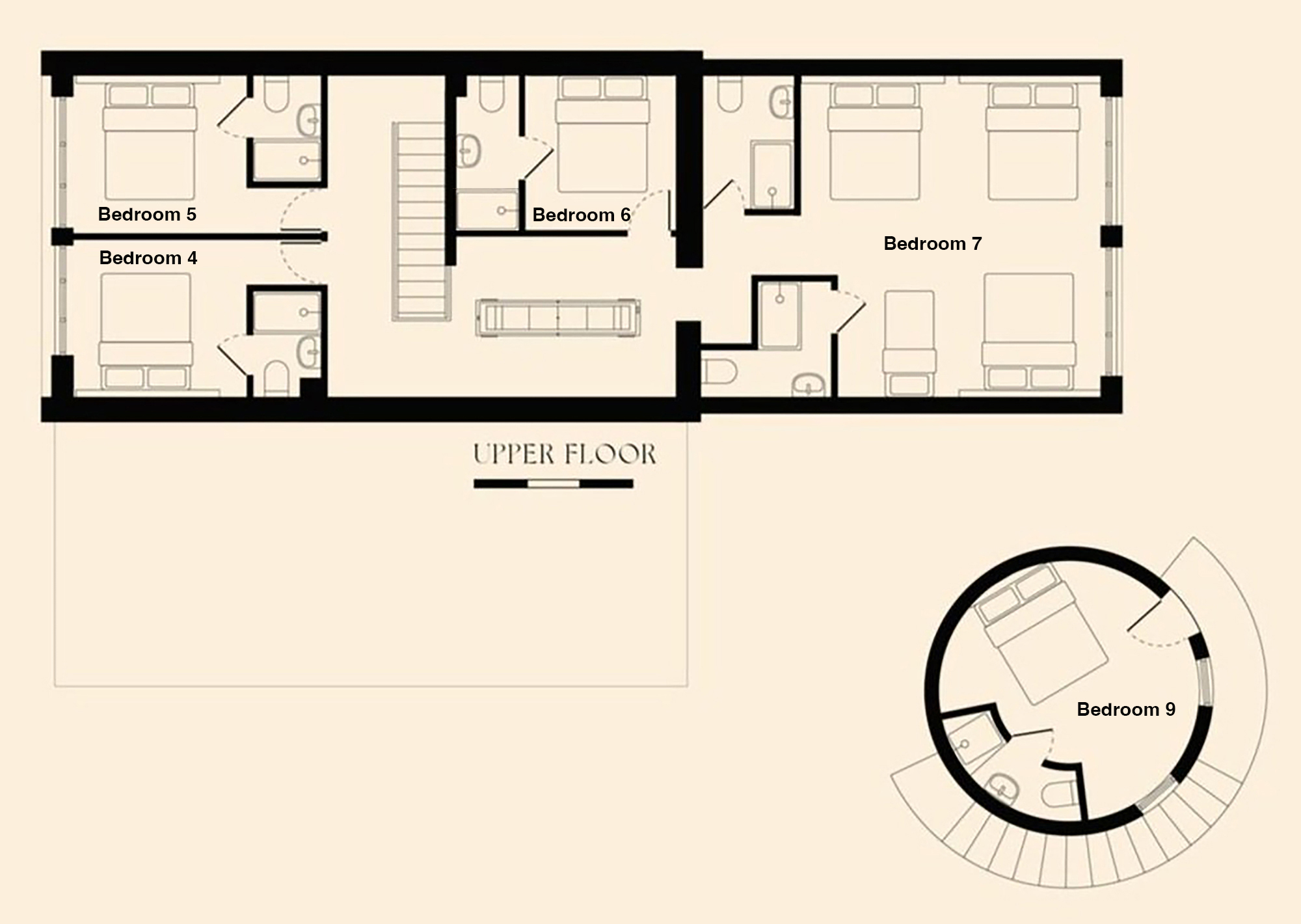 This is a huge upstairs room with 3 zip and link beds (king size or twin) and 1 single, and 2 ensuite shower rooms.