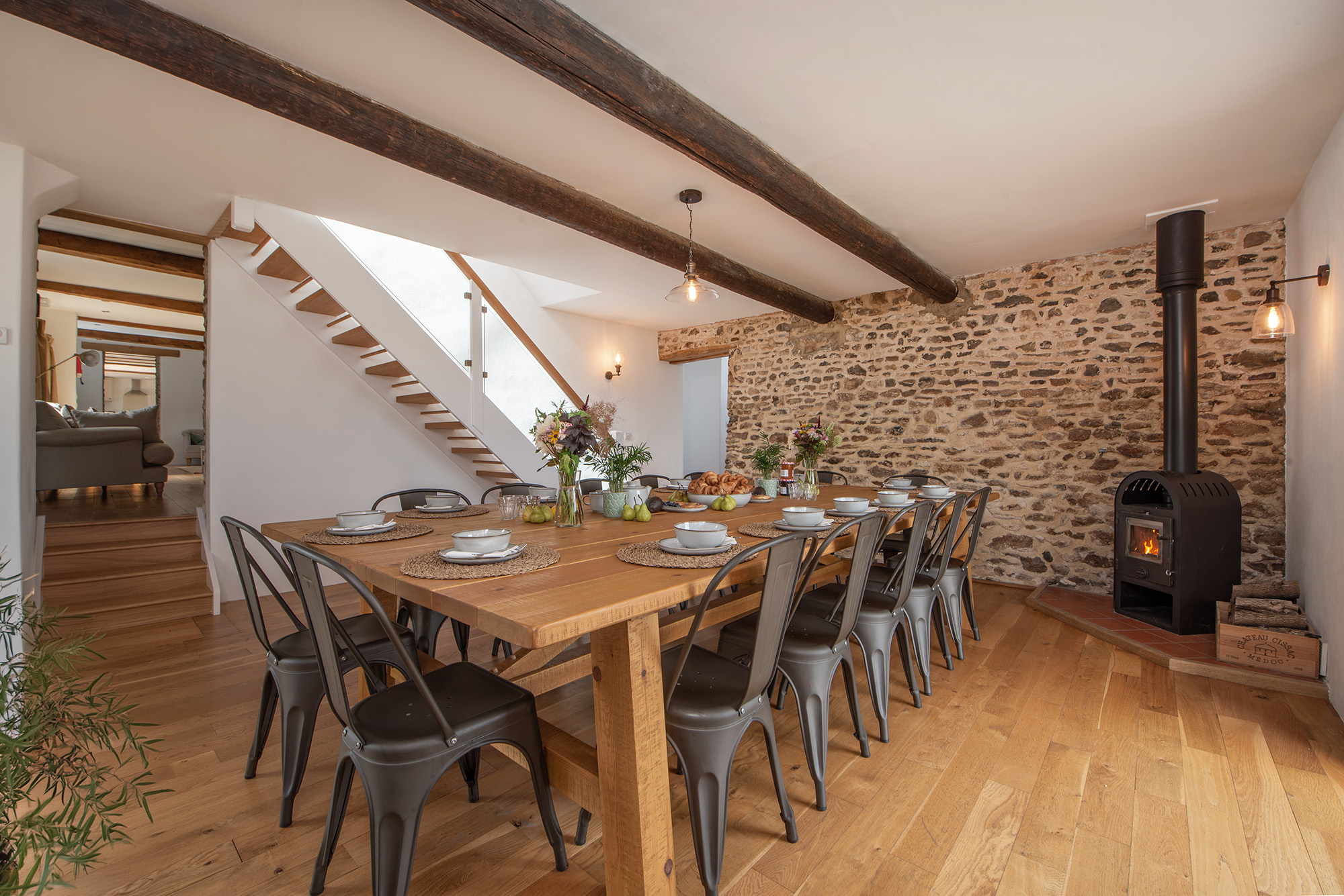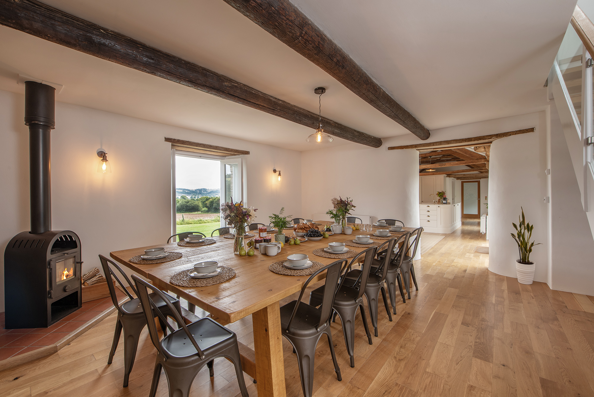 Meadows Drift - The Dining Room is simply styled, with a wood-burner for the colder months -