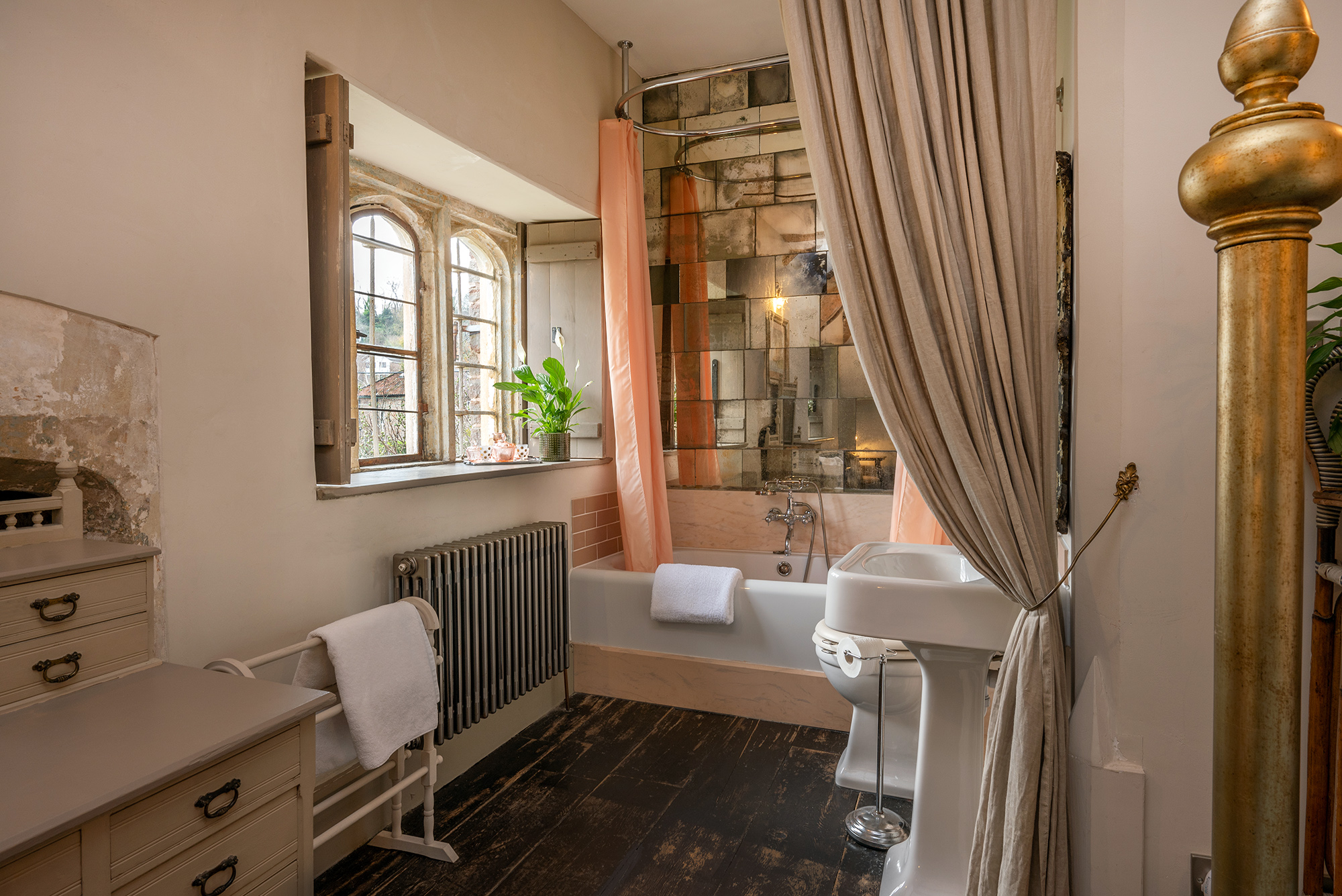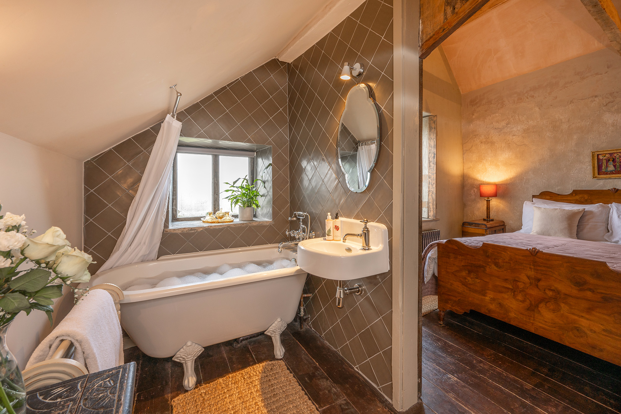 Mingleby Manor - The ensuite (curtained) bathroom for Bedroom 1 has a bath and overhead shower -