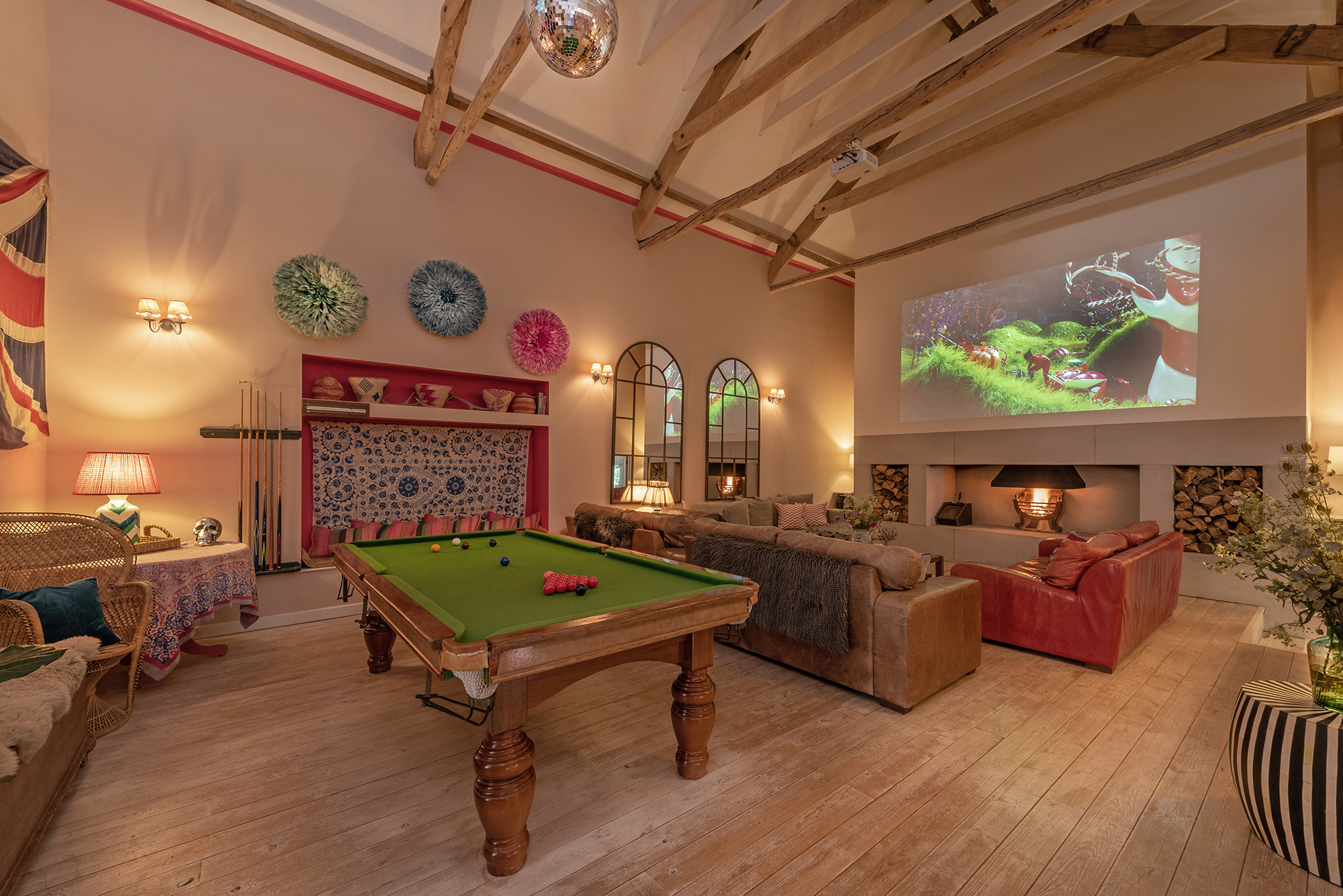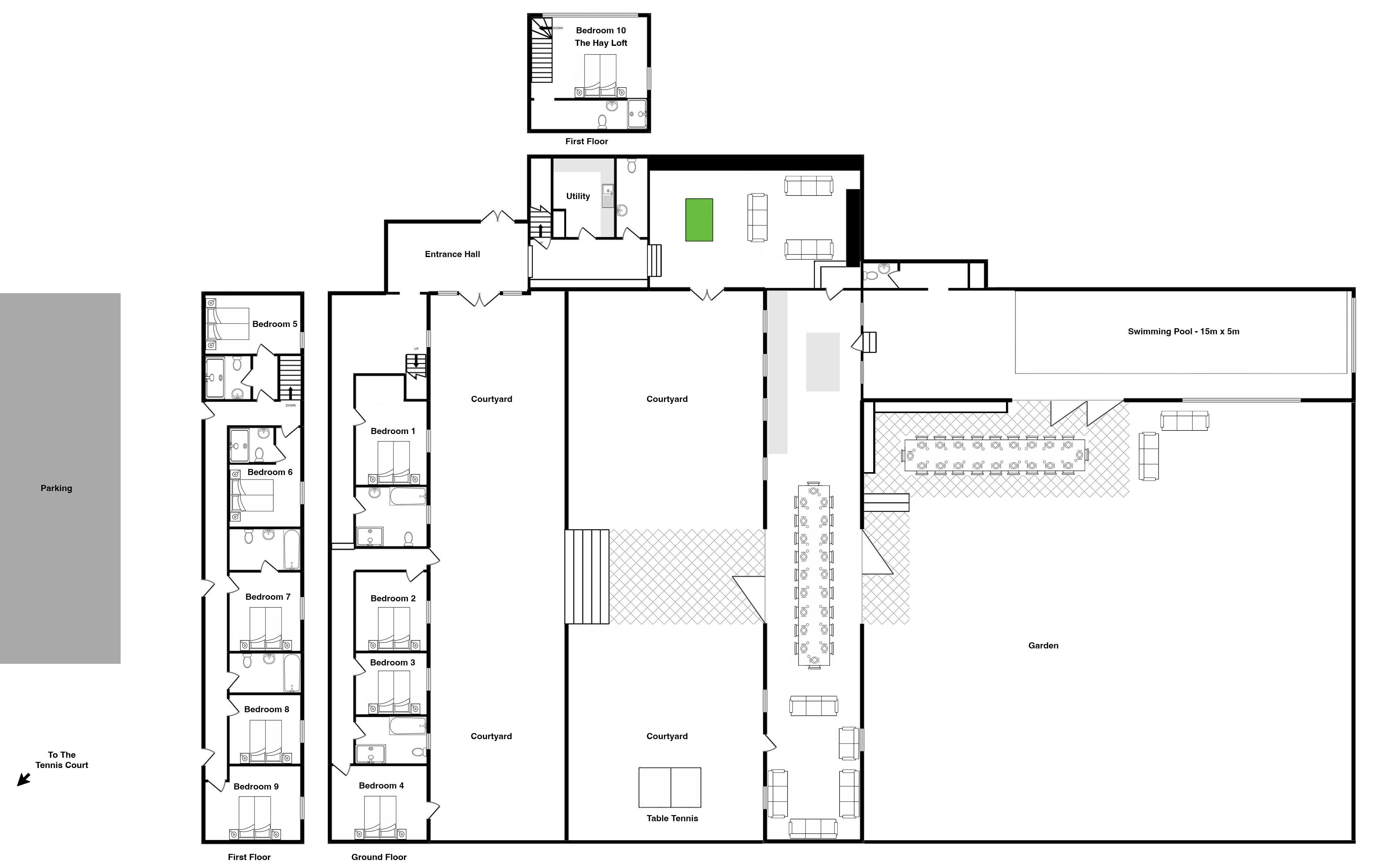 A first floor room with its own access via a secret door. Beds are zip and link (super king or twin) and thereβs a shower room. A window looks over the games room/cinema room.