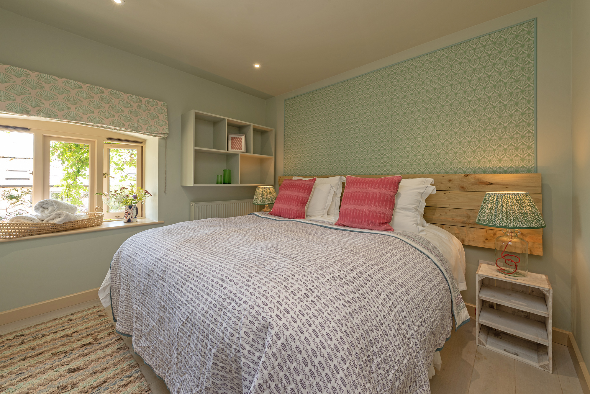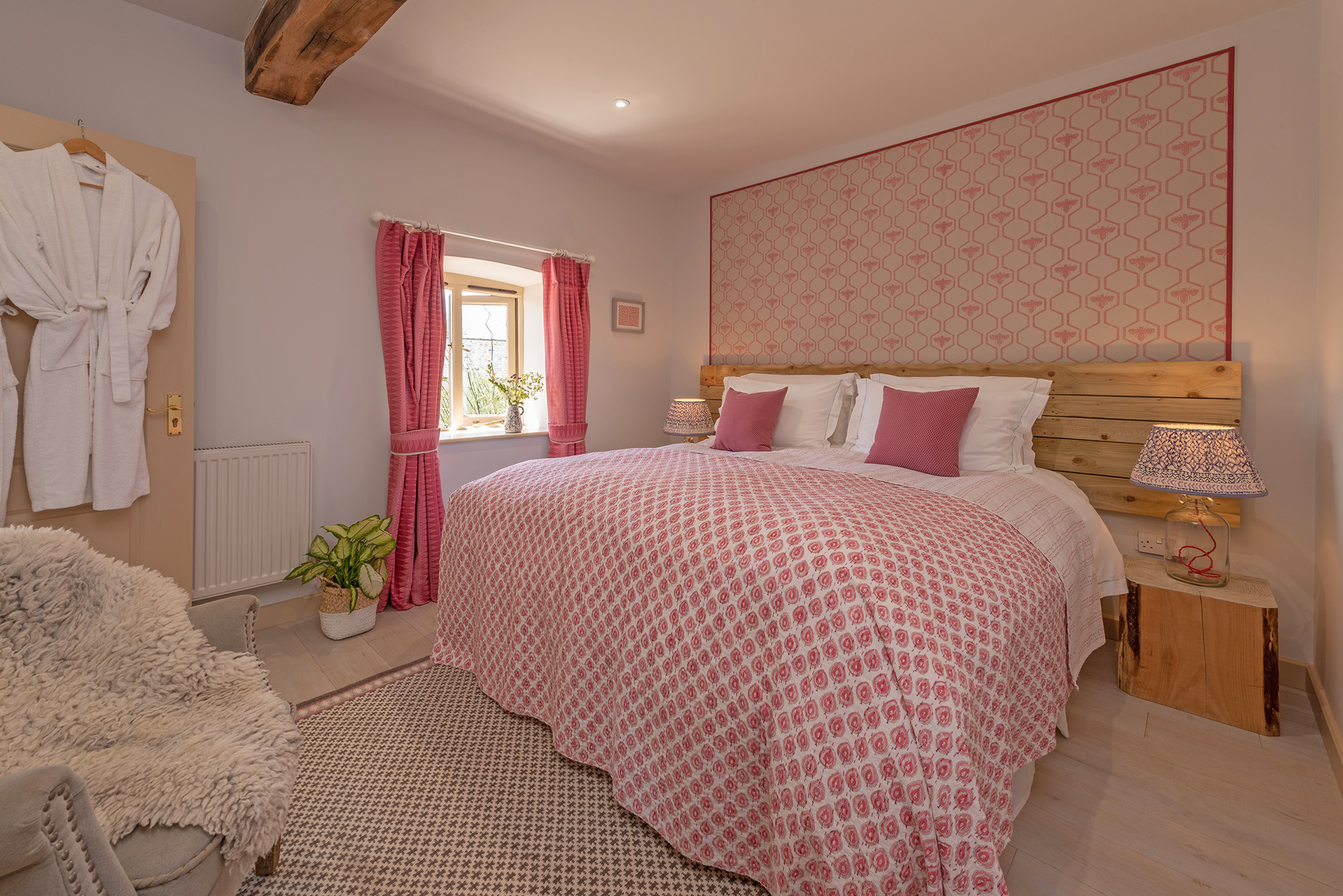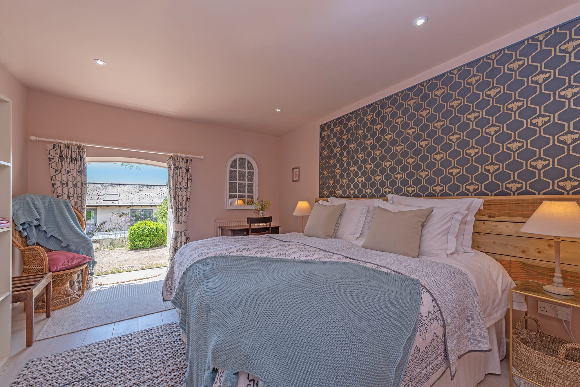 A ground floor room with zip and link beds (super king or twin) and shared use of either of the two family bathrooms on the ground floor, both with a bath and walk-in shower. This room has direct access to the courtyard.