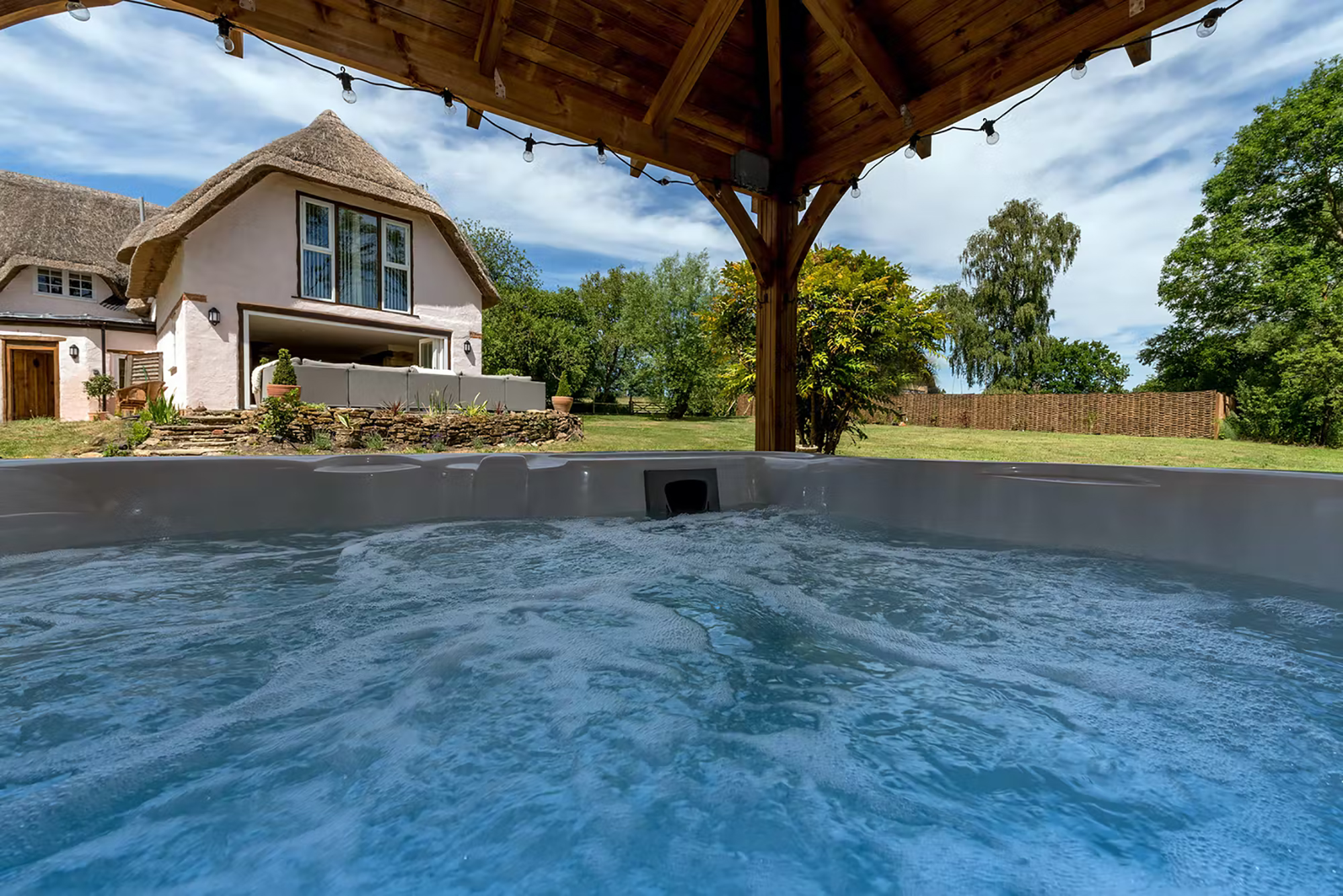 Pinklet - The covered hot tub is tucked away at the edge of the garden -