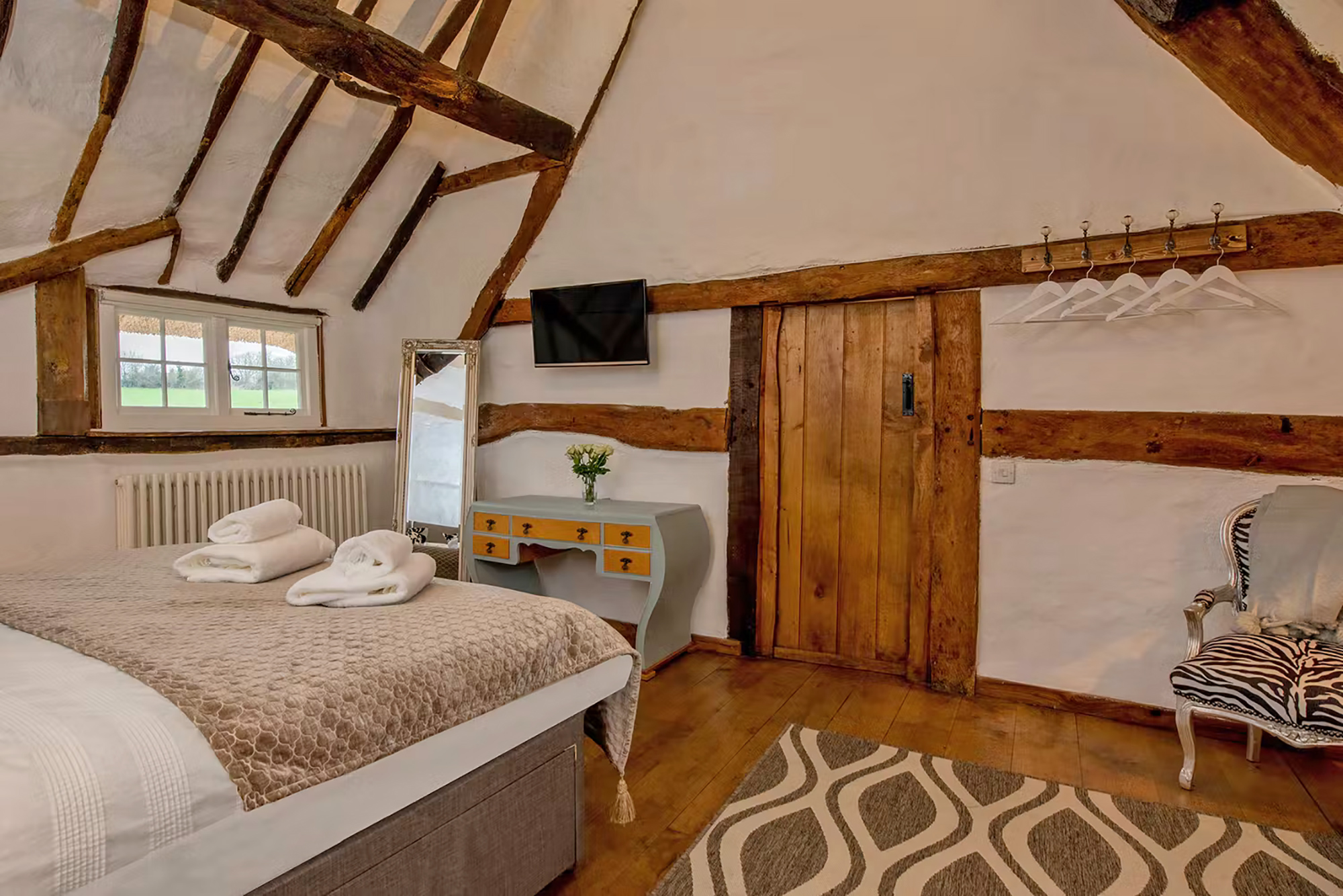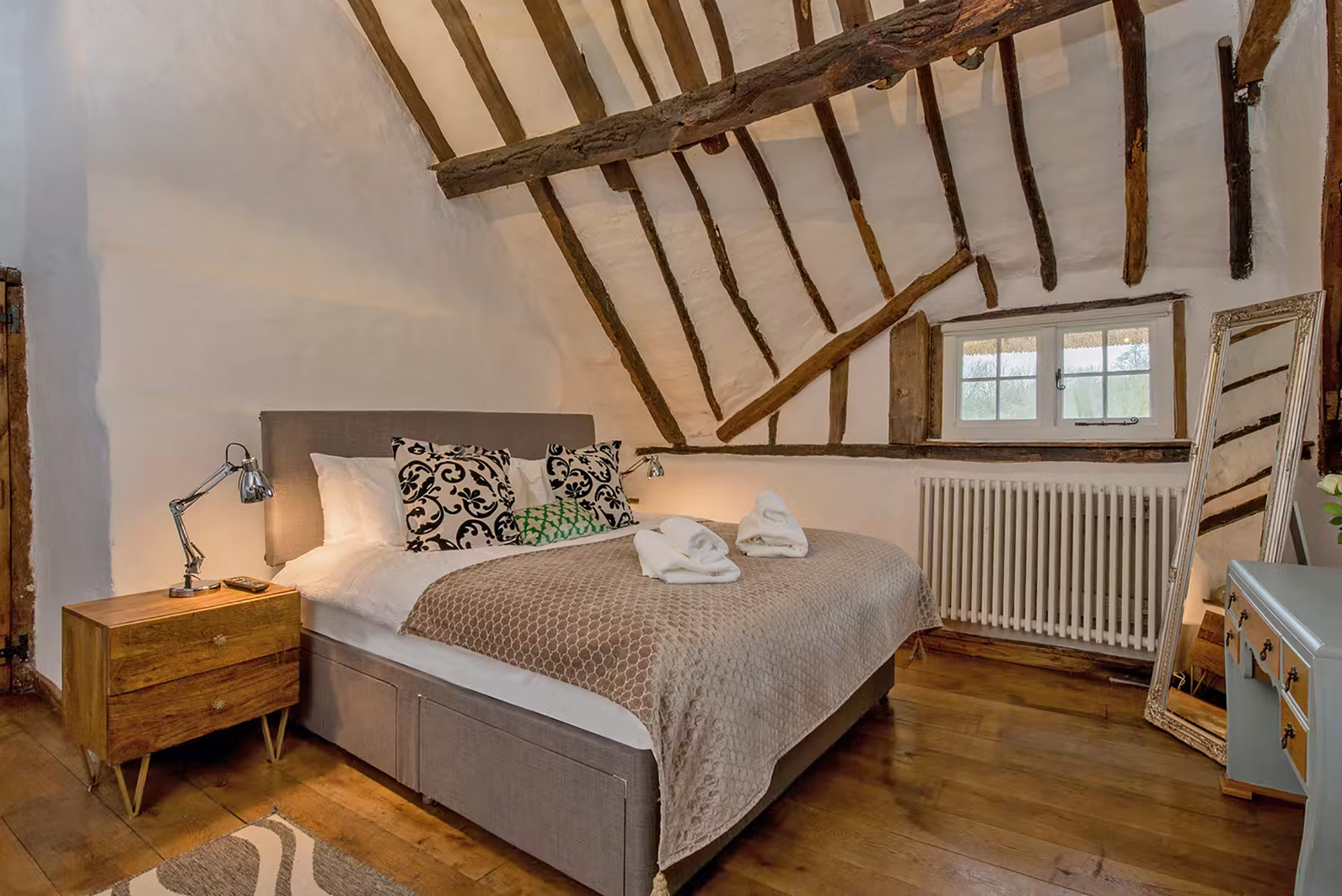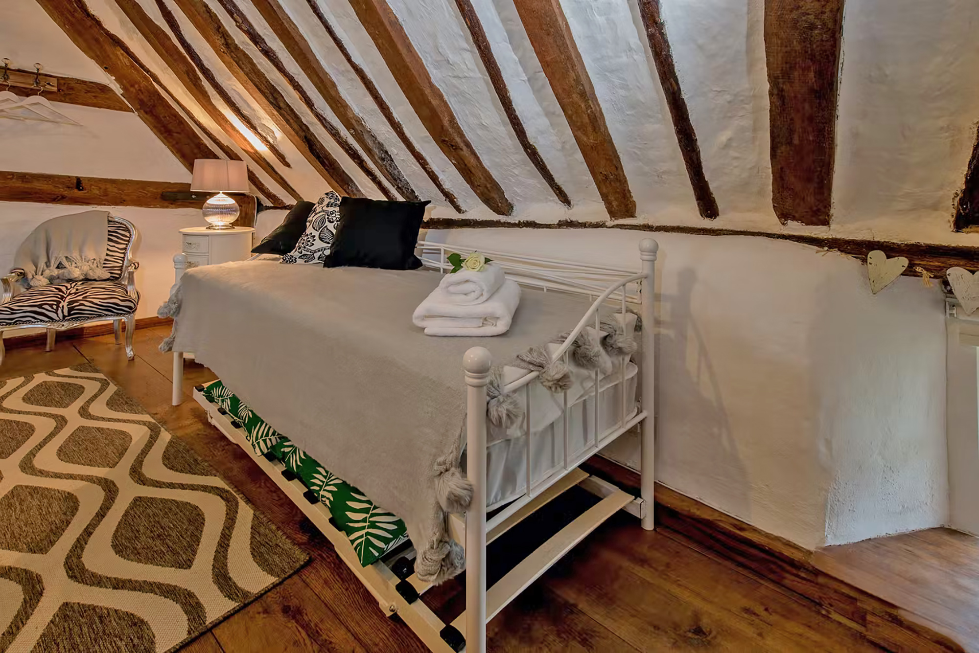 Pinklet - Bedroom 3: centuries old rafters soar to the apex (this room is now carpeted) -