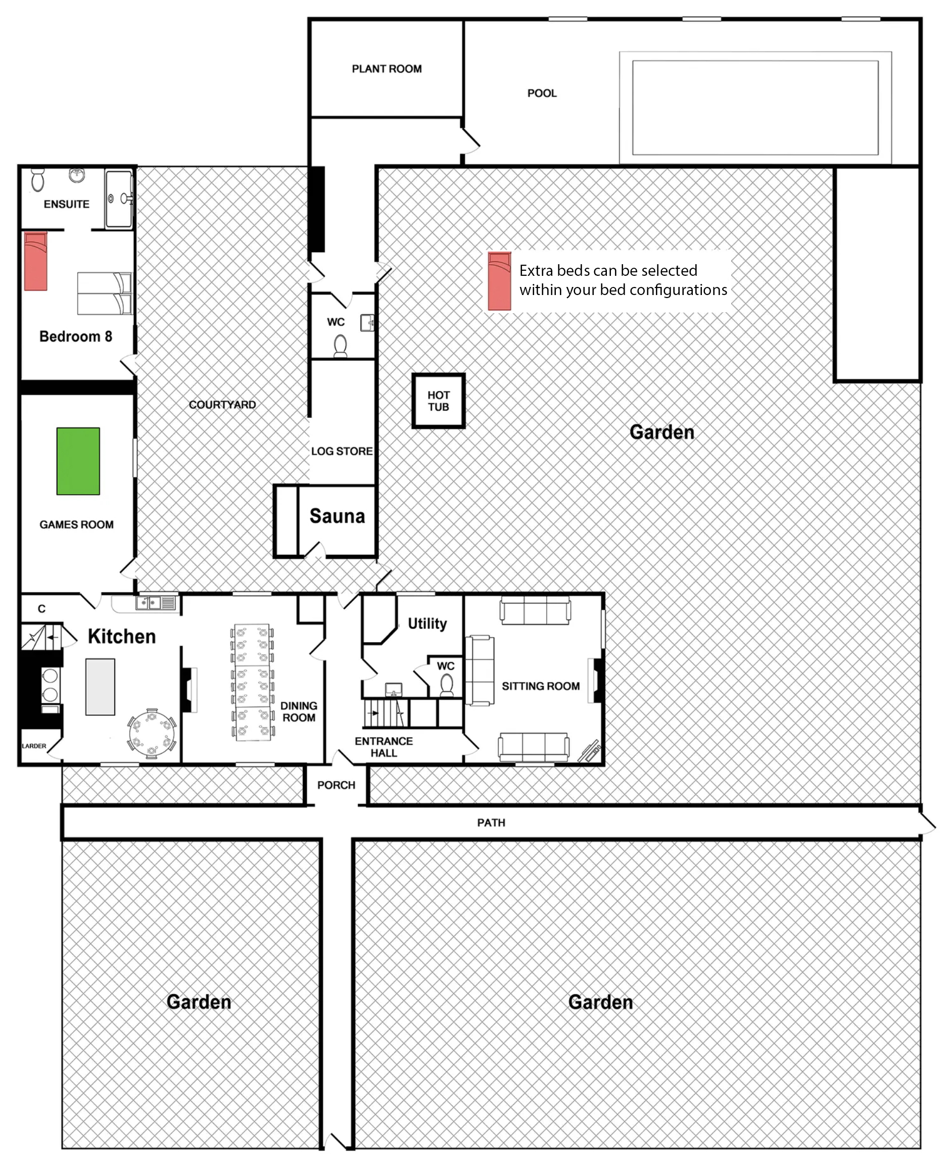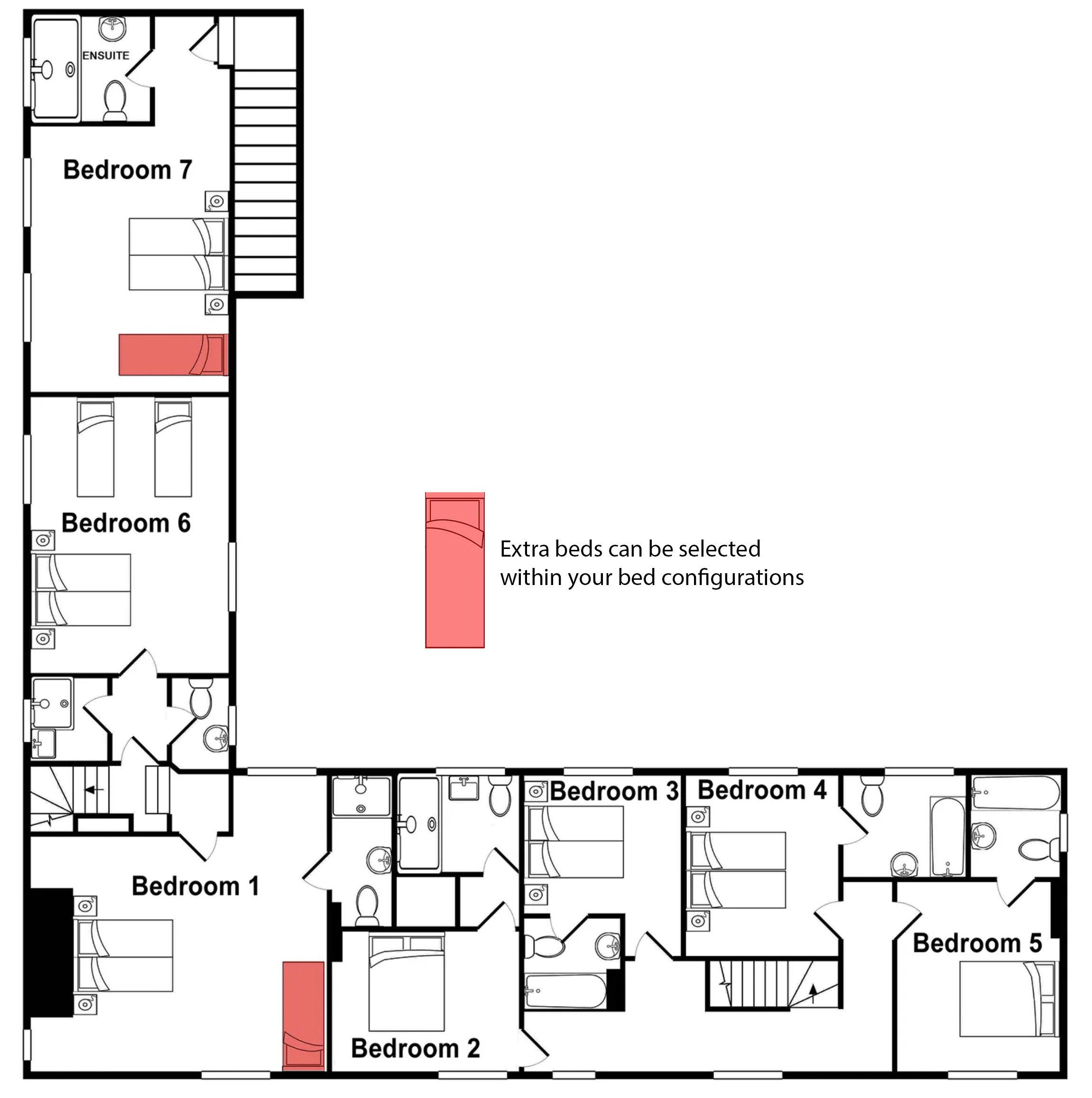 This room is on the first floor of the main house. It makes a great family room as it has 2 zip and link beds (2 super kings, a super king and 2 singles or 4 singles) and an ensuite shower room and WC.