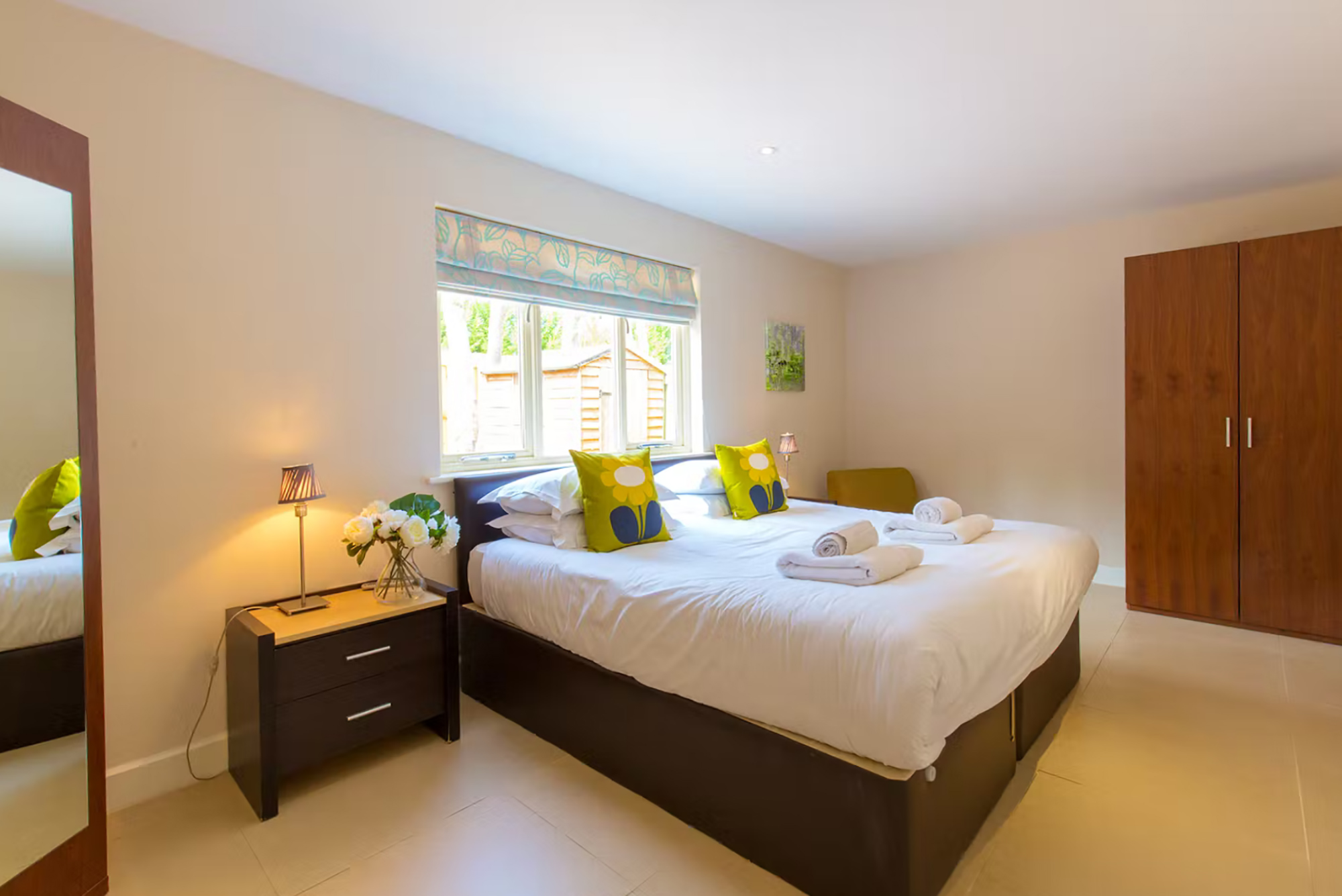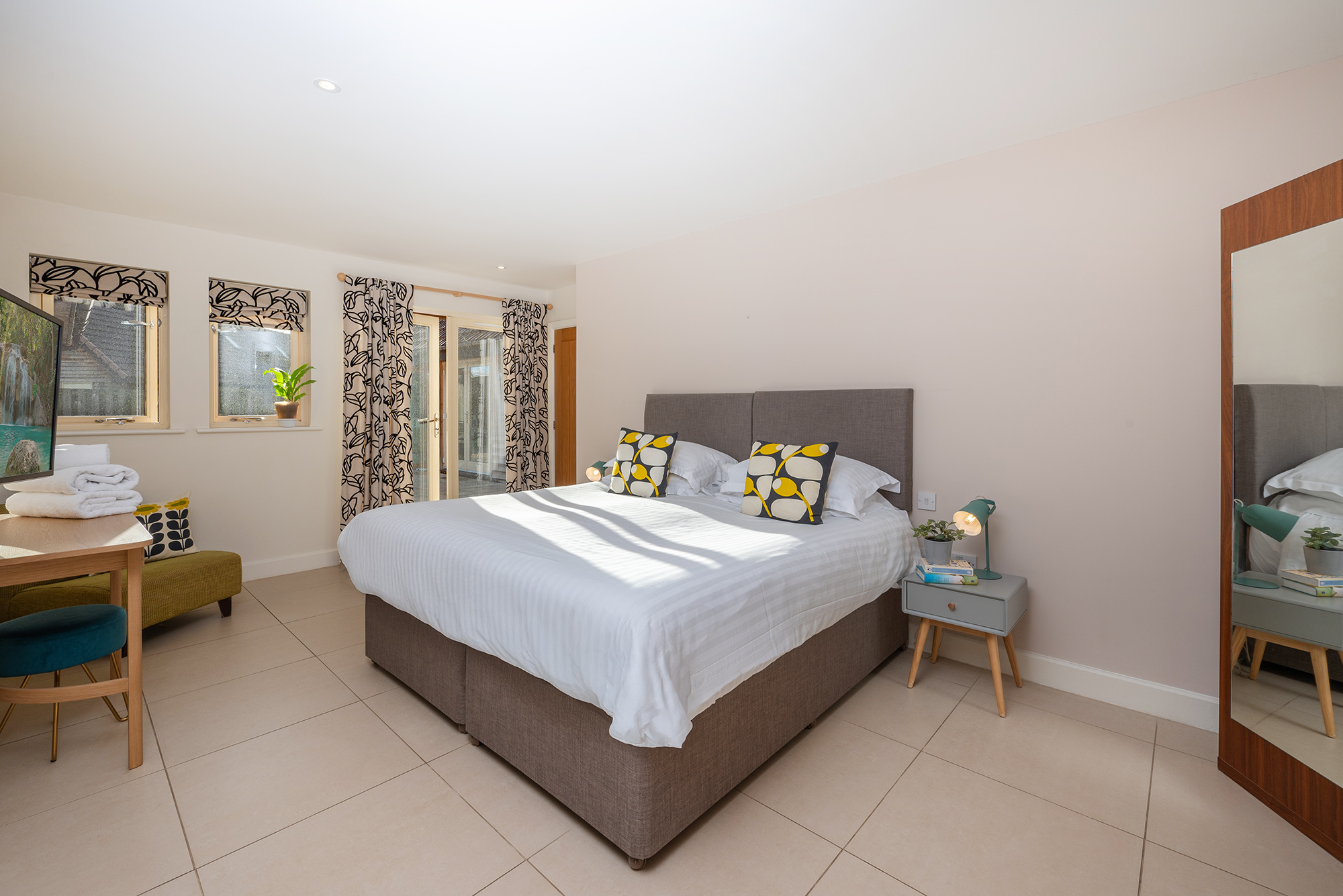 This large room on the ground floor can have a super king or twin beds. It has an ensuite shower room and doors that open onto the patio.