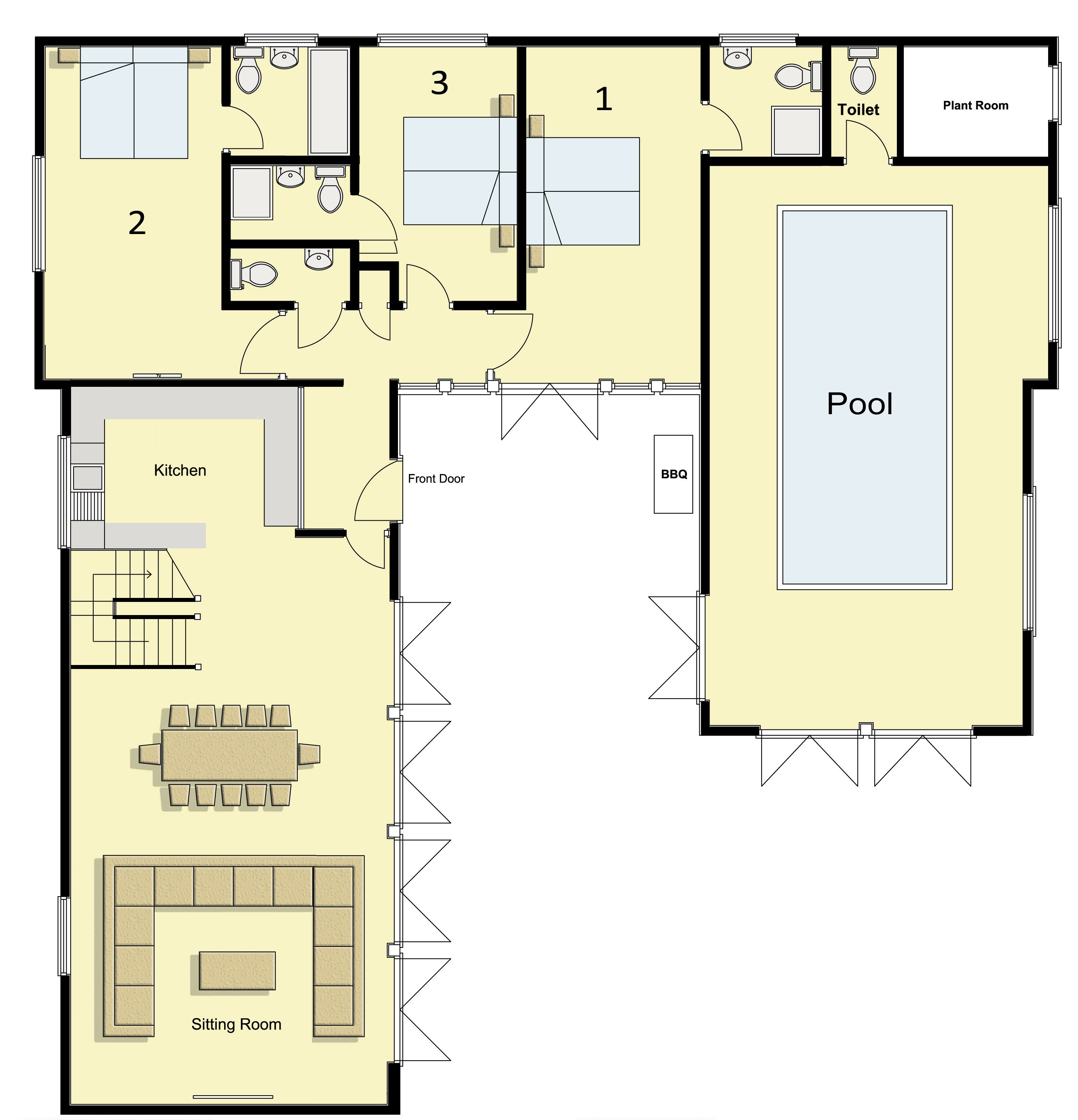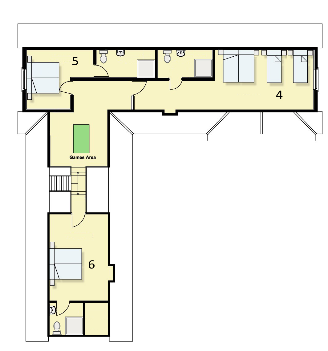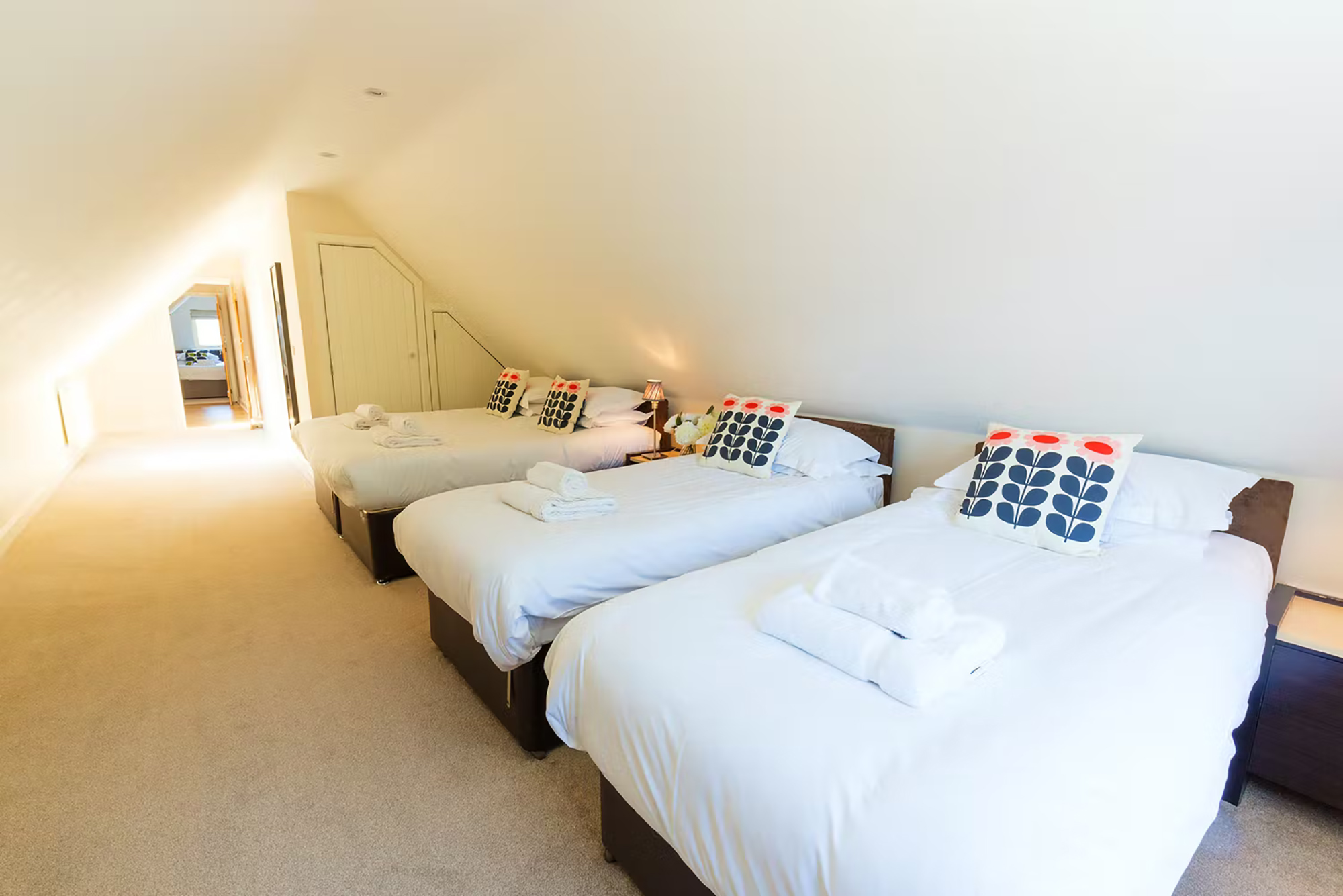 This is a family room on the first floor. It can have 4 single beds, 2 super kings, or a super king and 2 singles. It has an ensuite shower room.