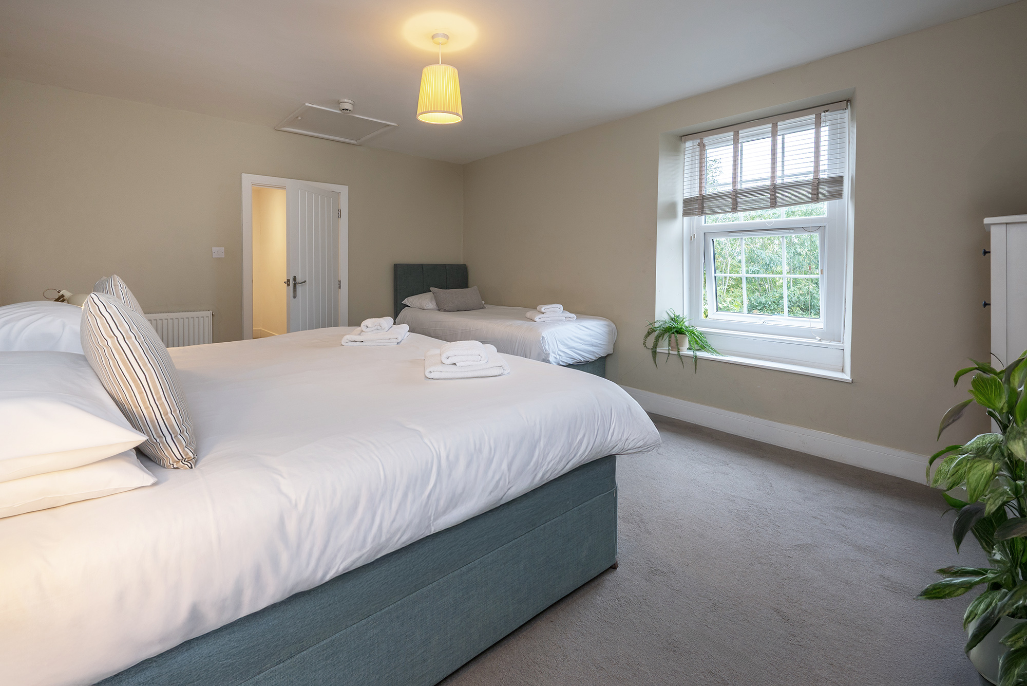 This room is on the first floor and has zip and link beds (super king or twin) and a single - great for a family with one child or for three friends sharing. The ensuite bathroom has a bath with overhead shower.